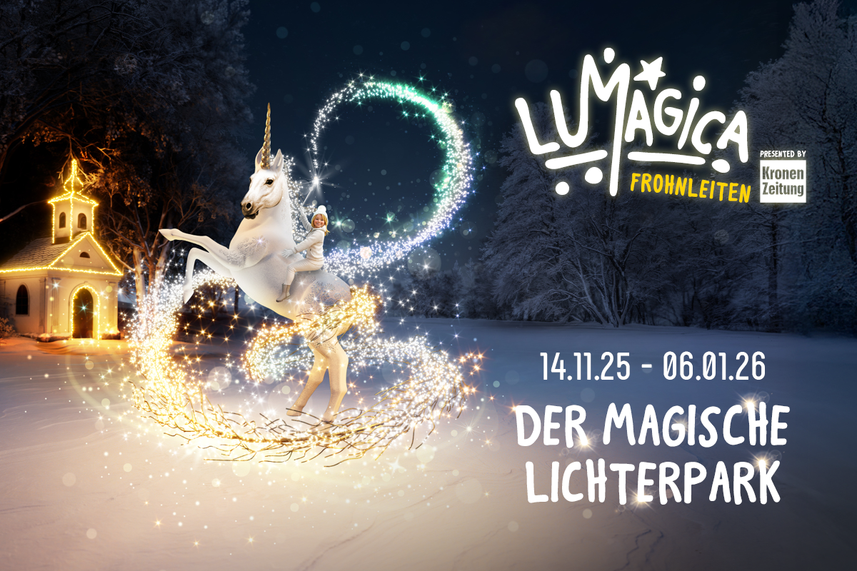The fascinating LUMAGICA light park at the Murhof near Frohnleiten invites guests from 14 November 2025 to 6 January 2026 to a sparkling winter wonderland and showcases a magical illuminated world in a natural setting. On a 1.5-km path, around 300 illuminated items can be admired, making for an unforgettable experience for all the family.