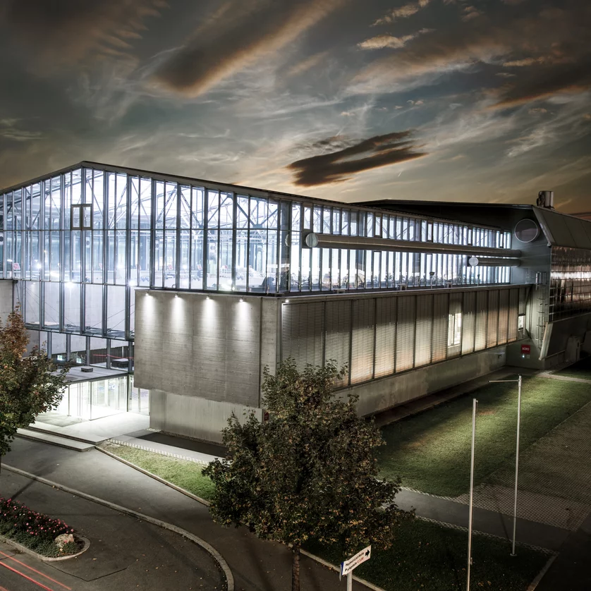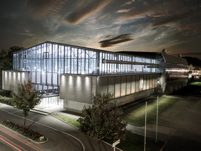 Außenansicht der Helmut List Halle in Graz bei Nacht. | © Helmut List Halle