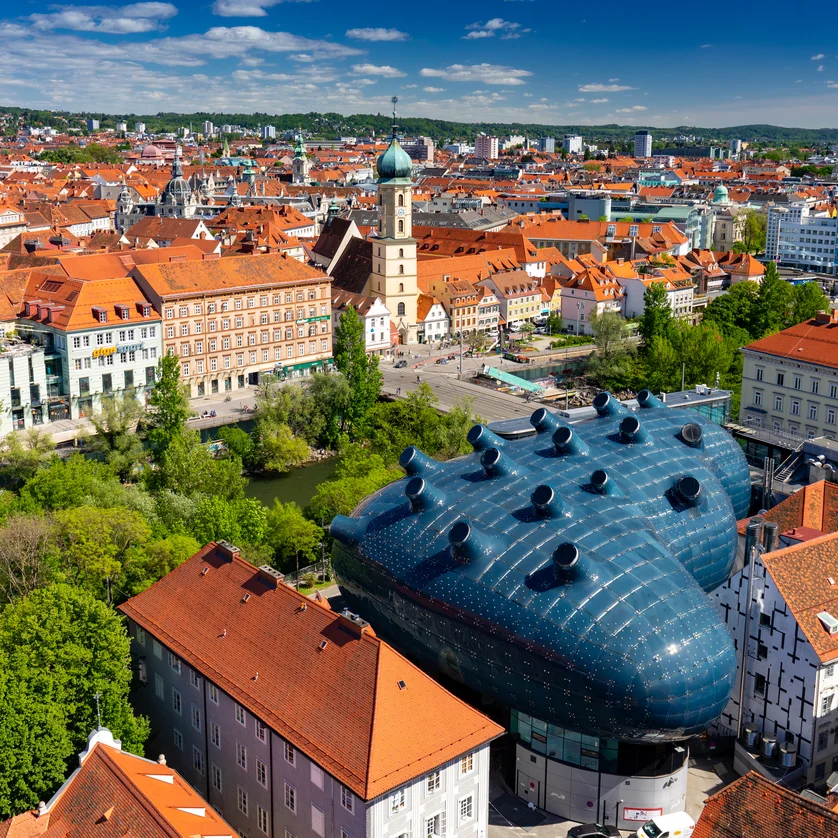 Blick auf Graz mit dem blauen Kunsthaus zwischen historischen Dächern. | © Graz Tourismus - Harry Schiffer