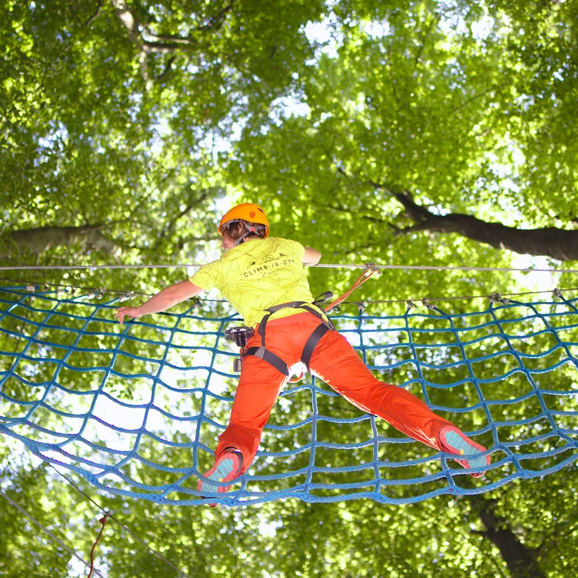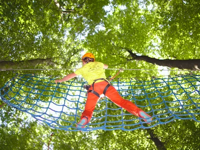 Bewegen Sie sich gut gesichert über Seilrutschen durch die Baumkronen, balancieren Sie auf Hängebrücken hoch über dem Waldboden und hangeln Sie sich an Kletternetzen geschickt von Baum zu Baum.