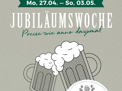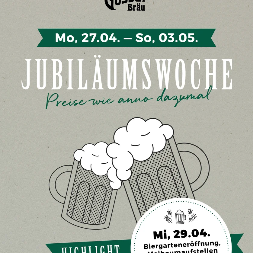 Im Gösser Bräu findet von Montag, 27.04. bis Sonntag, 03.05. die zweite Jubiläumswoche statt. Anlässlich dieses Ereignisses werden ausgewählte Speisen und Getränke zu besonderen Jubiläumspreisen angeboten – ganz im Zeichen traditioneller Wirtshauskultur.