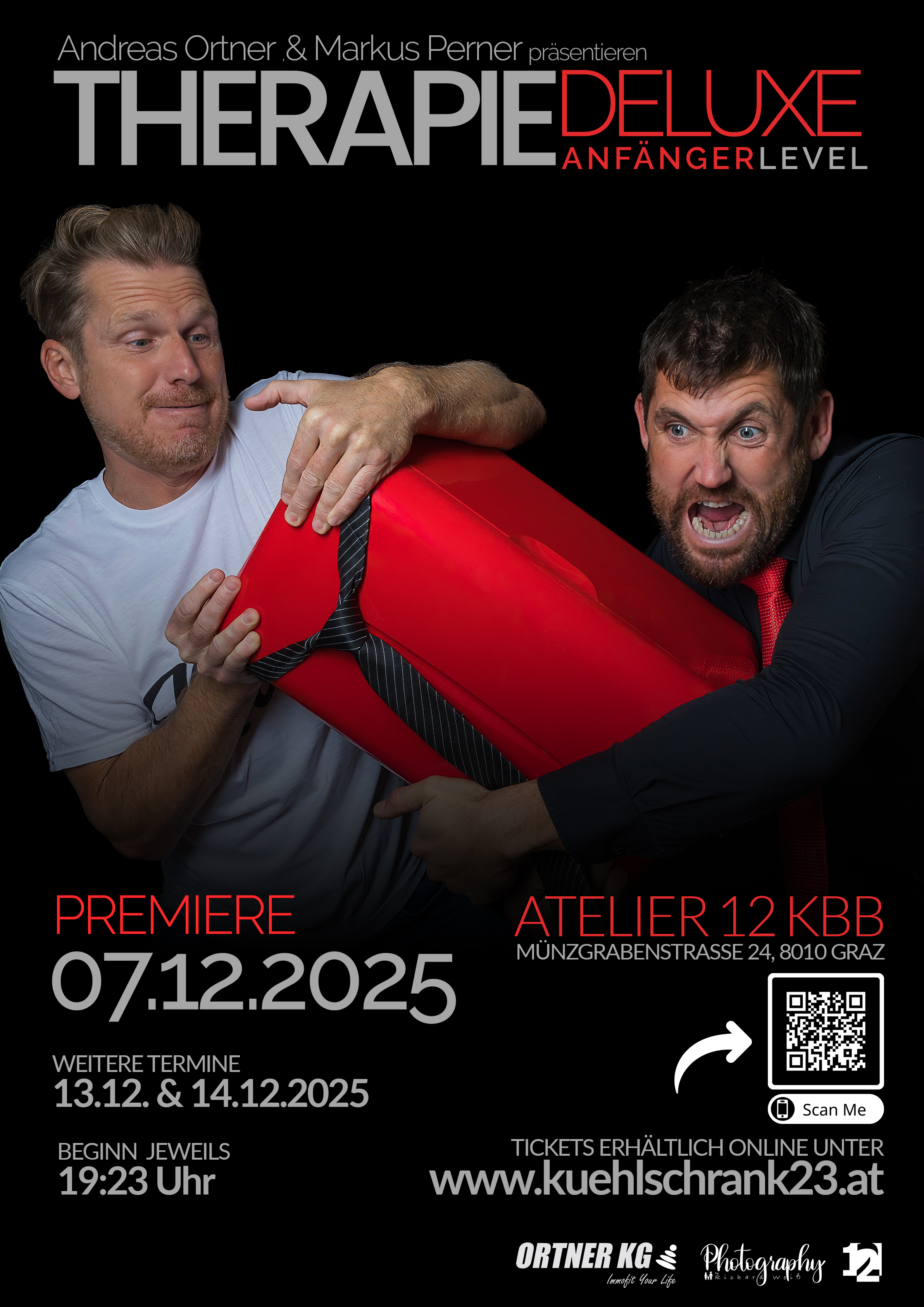 Was tun, wenn man sich bei gemeinsamen Filmprojekten nicht ausstehen kann? Andreas Ortner ‚AndiO2‘ und Markus Perner ‚Der Südsteirer‘ haben sich entschieden, dass einzig Vernünftige zu tun: Sie machen eine Therapie. Aber keine klassische – sondern sie haben gemeinsam ein Bühnenstück auf die Beine gestellt, welches am 07.12.2025 im Atelier 12 KKB Premiere feiert. Weitere Aufführungen sind am 13.12. und 14.12.2025 (Atelier 12 KKB).
