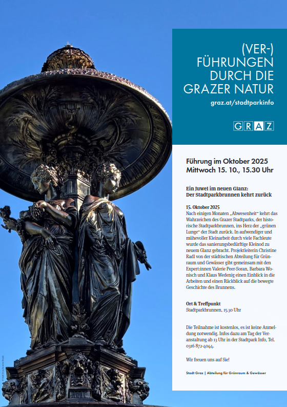 Nach einigen Monaten „Abwesenheit" kehrt das Wahrzeichen des Grazer Stadtparks, der historische Stadtparkbrunnen, ins Herz der „grünen Lunge" der Stadt zurück. In aufwendiger und mühevoller Kleinarbeit durch viele Fachleute wurde das sanierungsbedürftige Kleinod zu neuem Glanz gebracht. Projektleiterin Christine Radl von der städtischen Abteilung für Grünraum und Gewässer gibt gemeinsam mit den Expert:innen Valerie Peer-Soran (Kulturamt), Barbara Wonisch und Klaus Wedenig einen Einblick in die Arbeiten und einen Rückblick auf die bewegte Geschichte des Brunnens.