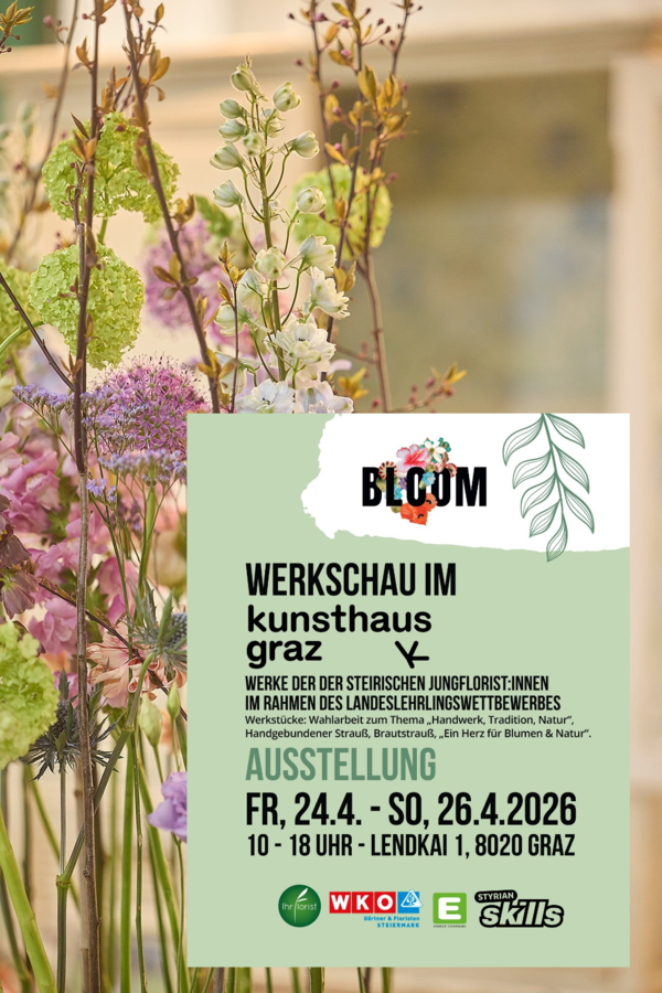 Beim diesjährigen Wettbewerb dreht sich alles um Handwerk, Tradition und Natur. Die Teilnehmer*innen zeigen in verschiedenen Aufgaben ihre Kreativität – von der Wahlarbeit über handgebundene Sträuße bis hin zu Brautsträußen und Herzarrangements. Jede Arbeit lebt von frischen pflanzlichen Materialien, die während der Wettbewerbszeit verarbeitet werden, und vereint technisches Können mit ästhetischem Gespür. Ob auf Säulen präsentierte Sträuße, kreative Herzarrangements oder individuell gestaltete Wahlarbeiten – alles steht im Zeichen von BLOOM, der Verbindung von Blüte, Inspiration und der Kraft der Natur.