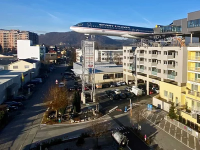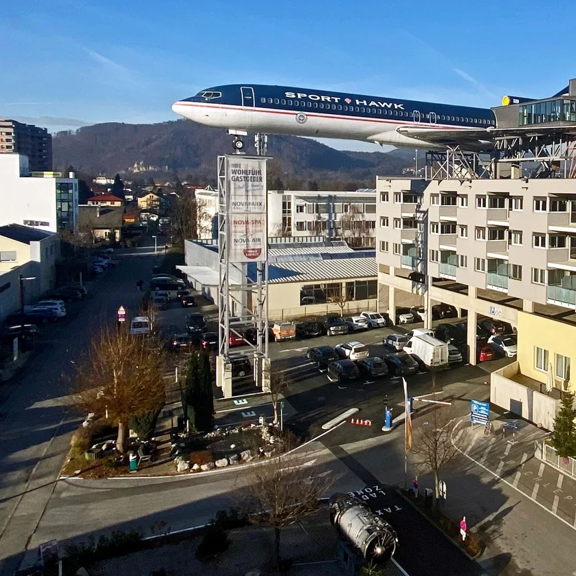 Located in the north of Graz is the "NOVAPARK Flugzeughotel" with 157 rooms and apartments. The “Nova-Air” on the hotel roof is a feature unique in the world. At an altitude of 22 metres, an Ilyushin and a Boeing serve as a bar and restaurant. Twenty-two seminar and event rooms (up to 900 people in one room) and the banquet department’s experience offer the ideal basis for your event. The Wellnessoase Nova-Spa, covering 3000 m², offers saunas, a pool and all the right things for you to relax.