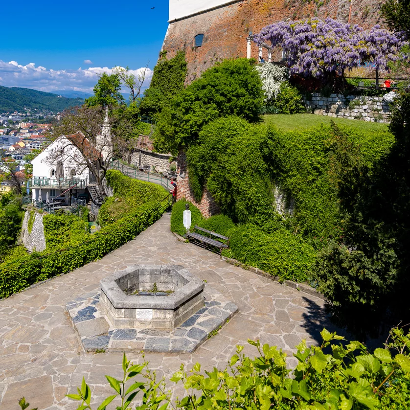 The so-called Turkish Well was built between 1554 and 1558 by the Styrian estates according to the plans of Domenico dell’Allio. The shaft to the groundwater of the Mur River, 94 meters deep, secured the fortress’s water supply. Initially known as Deep Well, the name Turkish Well became established in the 19th century due to the false assumption that Ottoman prisoners of war had carried out the construction. After the fortress had been destroyed in 1809, the well ring was blown up and its shaft filled with spoil. In 1820, Bonaventura Hödl purchased the well and made it usable again thanks to donations. The Turkish Well was given its present-day appearance in 1934 with the demolition of a wooden extension which had also been built by Hödl.