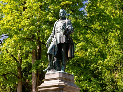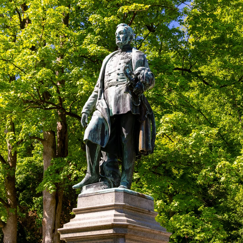 The greening of the Schlossberg is largely marked by the plans of the Imperial and Royal General of the Artillery and garden designer Ludwig Freiherr von Welden (1782 – 1853). During his time as divisional commander of Graz in 1839, he began to transform the barren rock into a romantic landscape garden based on the English model. His soldiers cleared away the rubble of the destroyed fortress and created a cultivated landscape lined with footpaths, plateaus and avenues. The bronze statue created by Hans Gasser commemorates the civilian merit of the military officer. In 1859, the monument was placed on the once busy plateau with its kiosk, water tower, music pavilion and the chalet, which burnt down in 1945.