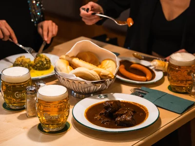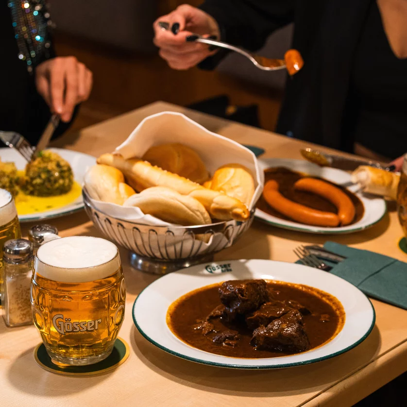 "The beer mug makes us wiser. The beer brings us pleasure." The many aficionados of the Gösser Bräu endorse Goethe's words and have been keeping the faith at this most traditional of beer taverns. Those who love a good pint and a hearty meal can choose from eight types of beer and satisfying fare comprising traditional and international cuisine. There's no shortage of space for larger groups either given that, including the garden and terrace, a total of 650 people can be seated.