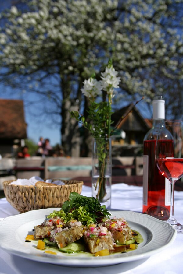 Lungo la Strada del Vino Schilcher ci sono tante possibilità di gustare la cucina stiriana, per esempio la cosidetta "Brettljause" (una merenda con prosciutto stiriano, paté, pane ecc.)