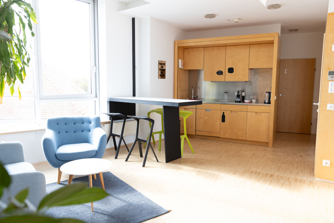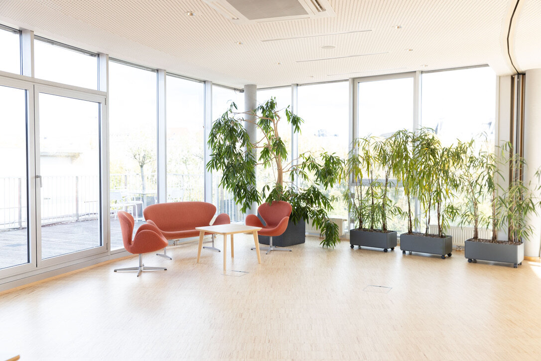 Eingangsbereich (mit Garderobe) inkl. Küchenzeile und Aufenthaltsbereich, zwei getrennte Toiletten, Abstellraum, Dachterrasse, 6 - 24h geöffnet, rauchen erlaubt auf der Dachterrasse, Lift vorhanden