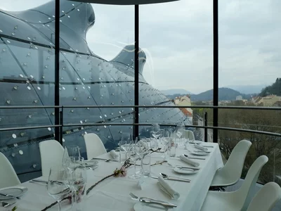 Located on the right bank of the Mur, the Kunsthaus Graz forms a contrast in styles with the historic city centre and has become the architectural emblem of Graz. It also has been carried with the Austrian "Green Location" eco-label since recently. Contemporary art exhibitions and memorable event locations offer the right setting for your events, with the “spacey” architecture and Vitra Design furnishings providing that special touch. Candlelight dinners, presentations or panel discussions, the remarkable ambience of Space04 and Needle in Kunsthaus Graz makes your impressive event unforgettable.”
